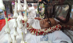 As the mortal remains of former West Bengal Chief Minister Buddhadeb Bhattacharjee were brought out from the Peace Heaven mortuary for his ...