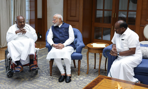 Former Prime Minister H.D. Deve Gowda and his son and Union Minister for Heavy Industries and Steel H.D. Kumaraswamy met Prime Minister...