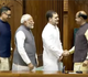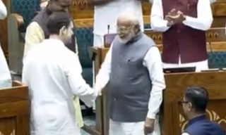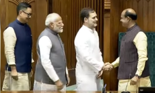 Congress leader Rahul Gandhi shook hands with Prime Minister Narendra Modi as they came together to welcome the newly-elected Speaker of the 18th Lok Sabha, Om Birla, on Wednesday. ...