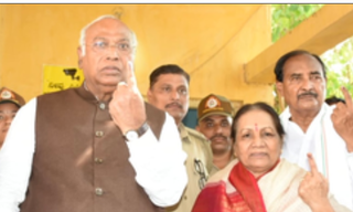 Congress President Mallikarjun Kharge cast his vote at the polling booth set up at Kannada Higher Primary School in Bramhapura locality in Kalaburagi district. ...