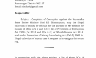 A complaint was lodged against Karnataka Minister for Excise R.B. Thimmapura with the Enforcement Directorate (ED) alleging that he was involved in illegal money collection for the upcoming Lok Sabha elections....