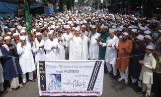 People participate in the funeral in absentia (ghaibana namaz-e-janaza) of 1993 Mumbai serial bomb blasts convict Yakub Memom, who was executed on 30th July 2015 in Nagpur Central Jail; in Kolkata, on July 31, 2015....